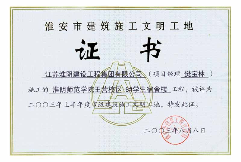 2003年市级文明工地淮阴师范学院王营校区8#学生宿舍楼(樊