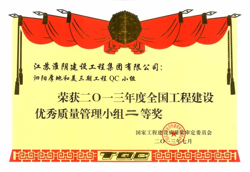 2013年度全国工程建设优秀质量管理小组二等奖(泗阳厚地和美三期)