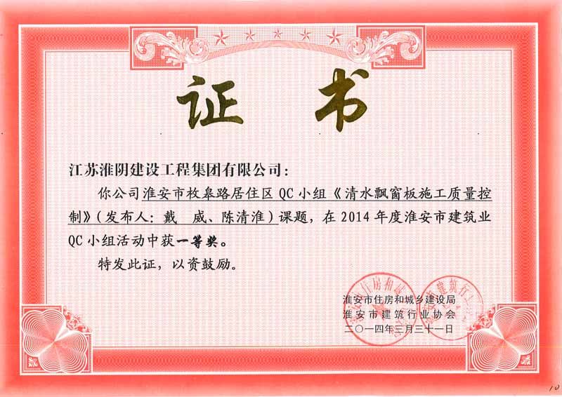 2014年度QC一等奖淮安市枚皋路居住区《清水飘窗板施工质量控制》戴威、陈清淮